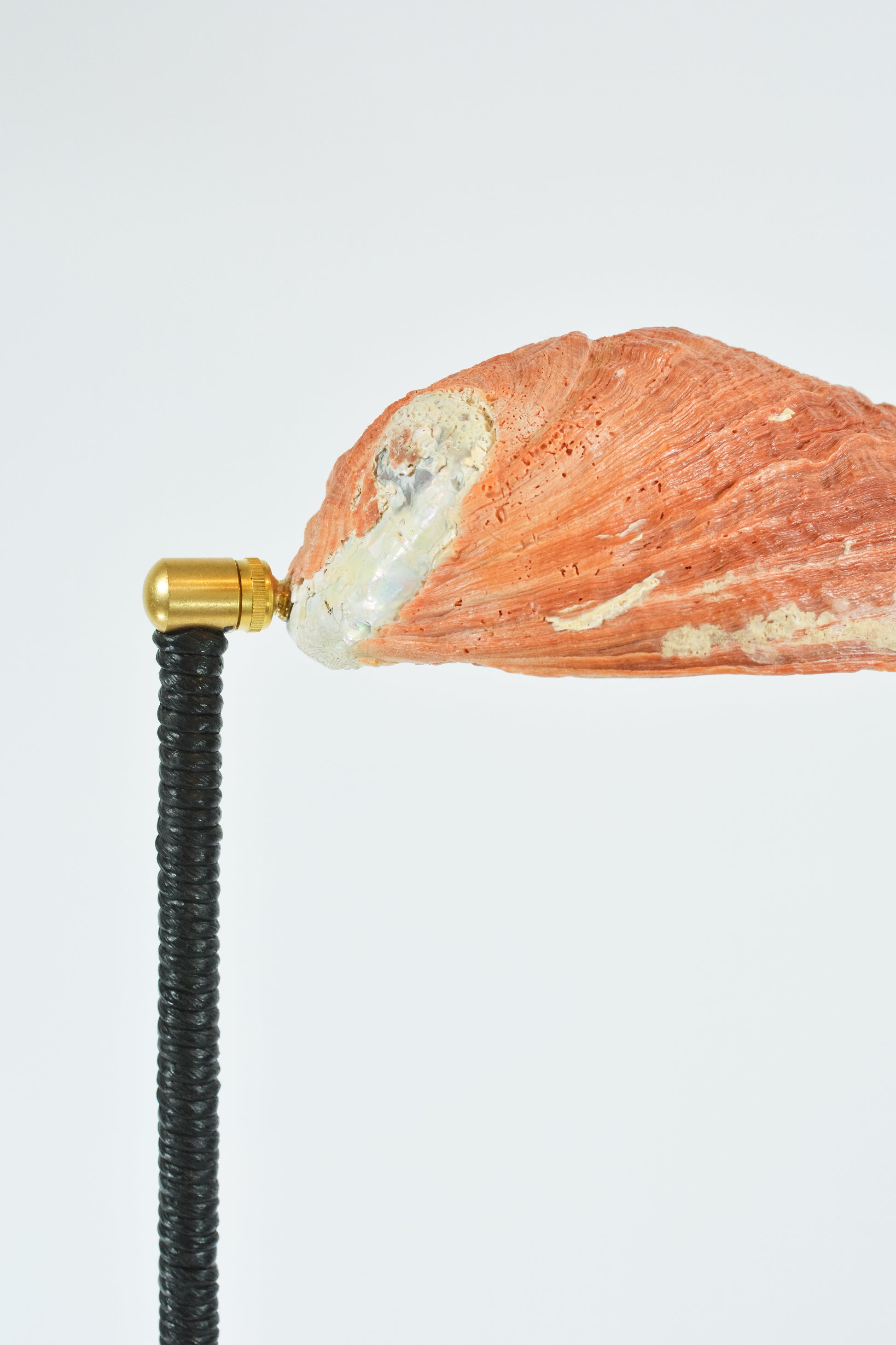 Standing 53.5” tall, Model No. 050 consists of a terra cotta-tinted cast hydrocal-plaster base in the shape of an abalone seashell; a mahogany stained, hand-wrapped papercord-column; and a cantilevered shade crafted from a rare, XXL vintage Red Abalone seashell with a yellow-hued mother-of-pearl interior, sourced from a California collector.